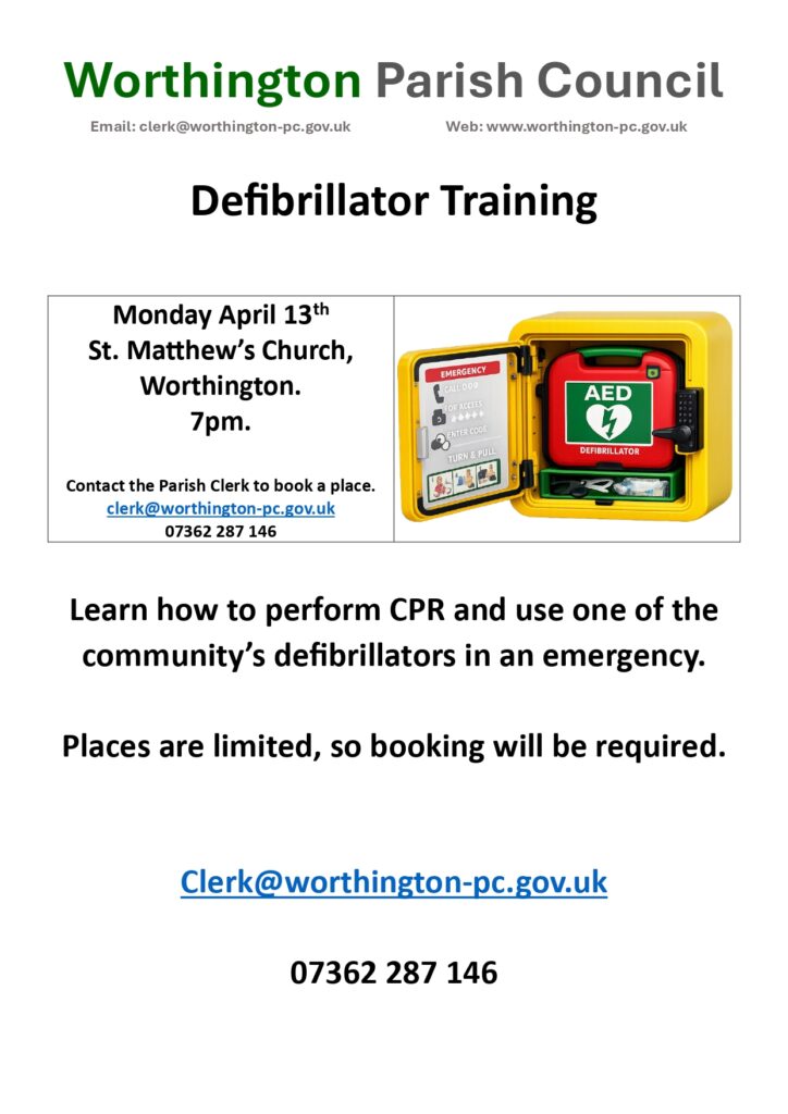 We stil have a few places available for our first Defibrillator and CPR Training on Monday 13th April, St. Matthew’s Church, Worthington.